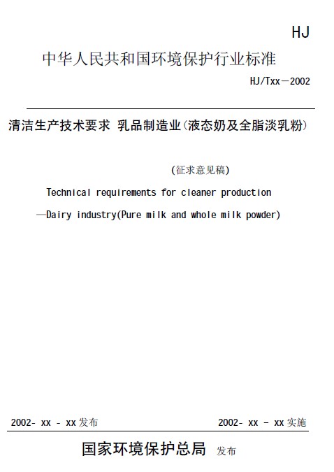 《清潔生產技術要求 乳品制造業(液態奶及全脂淡奶粉)》(征求意見稿)