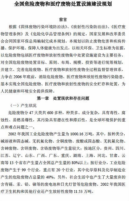 全國危險廢物和醫療廢物處置設施建設規劃